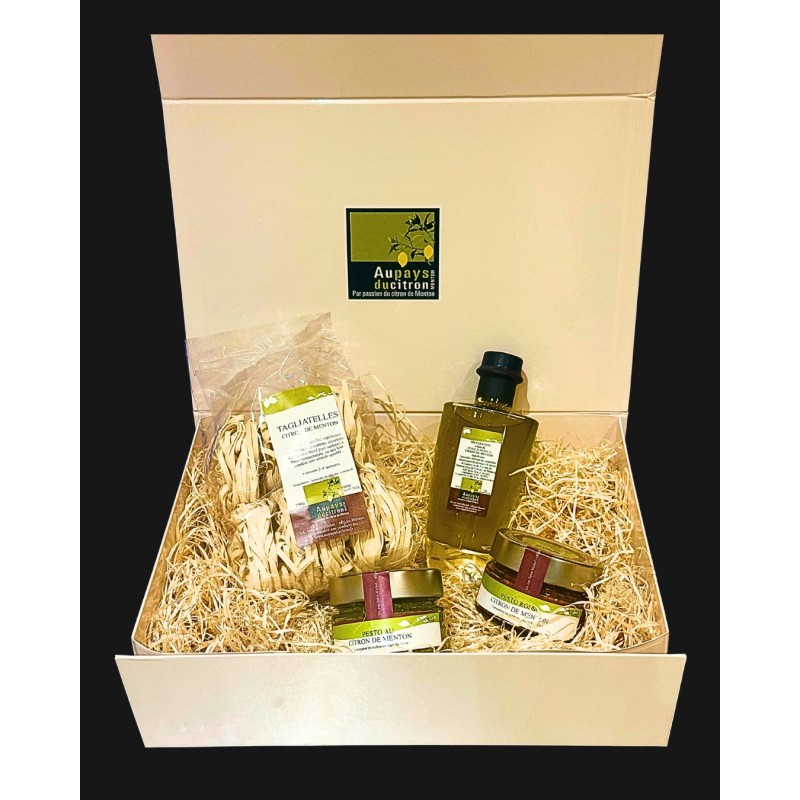 Un sachet de tagliatelles au citron de Menton 250gr, un pesto rosso au citron de Menton 120gr, une huile d’olive au citron de Menton 20cl, un pesto au citron de Menton 120gr.